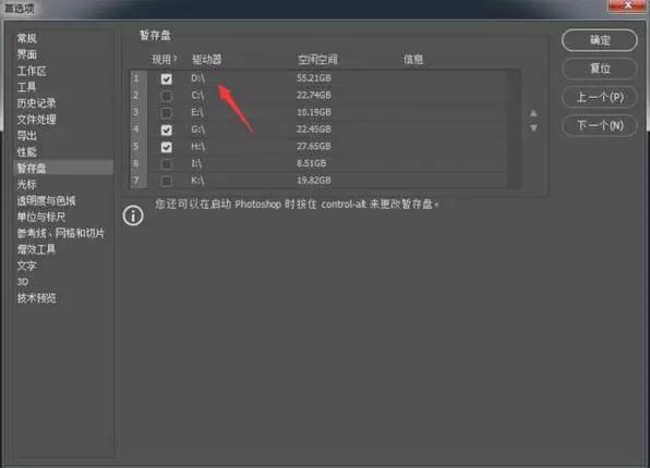 這個設(shè)置規(guī)則很簡單,不要設(shè)在C盤,C盤是系統(tǒng)盤,在電腦運行時是很忙地,選一個空間大的空閑盤做暫存盤會加快操作速度,當(dāng)然多選幾個也可以。如果你電腦上配有固態(tài)盤和機械盤,暫存盤一定要設(shè)在固態(tài)盤上,道理顯而易見。